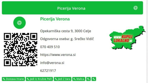 Beleži osnovne podatke o ponudniku, delovni čas, ter opiše ponudbo po alinejah. Vključena je tudi QR koda za promocijske potrebe destinacije.